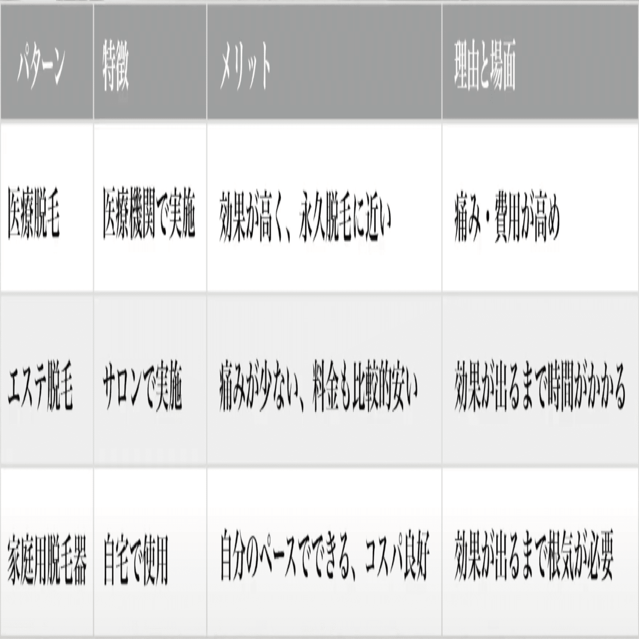 脱毛方法を比較(医療・美容・家庭用)